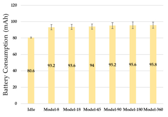 Battery resource usage is a factor that greatly affects the activity radius and service time of autonomous driving vehicles because the mobile edge computing environment uses batteries as a basic operating condition. It is necessary to apply a resource-efficient model to autonomous driving vehicles to extend the limited battery life as much as possible. Figure 13 measures battery consumption while periodically inputting LiDAR data into six neural network models and predicting driving commands for 10 min. Each model was measured 10 times, and the averages were compared. Power in the standby state (Idle) was consumed by an average of 80.6 mAh. Model-8, with the least amount of input data to process, consumed 93.2 mAh on average, and Model-360, with the largest amount of input data, consumed 95.8 mAh on average. This experimental result shows that as the number of input data increases, the battery consumption increases, but not significantly in proportion to the number of data. When comparing the standby state and Model-8, the battery consumption increased by 12.6 mAh. As the size of the input increased from Model-8 to Model-360, the battery consumption increased by an average of 0.52 mAh. Furthermore, batteries are consumed to operate multiple hardware components including motors as well as to determine driving commands for an autonomous vehicle to move. These experimental results show that the battery consumption required to calculate the neural network algorithm does not account for a large portion of the total battery consumption of an autonomous vehicle.