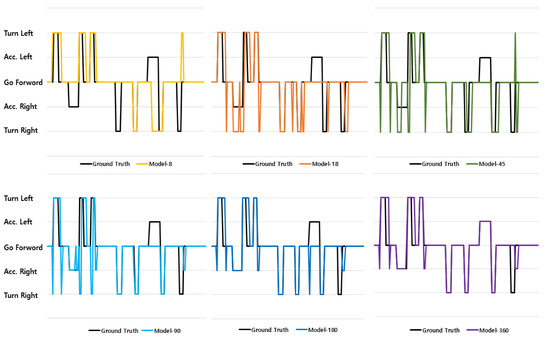 Figure 14 depicts the experimental results for the six models. The driving route is shown in Figure 10. A total of 153 driving commands were predicted while driving. The driving command to be executed during actual driving was compared with the driving command predicted by the neural network. The movement of the plot lines in the vertical direction indicates the execution of a command while the vehicles move along a straight line.