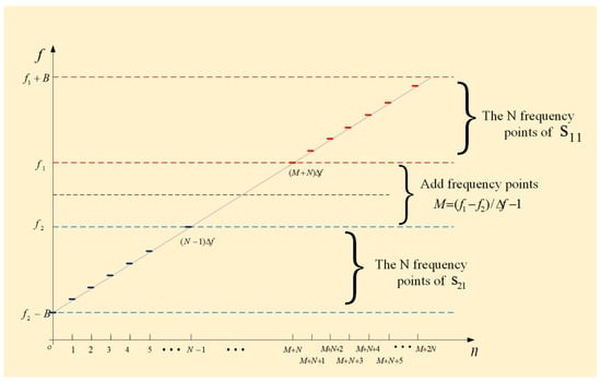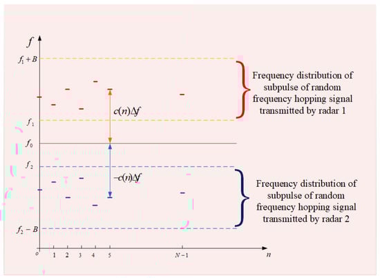 The random frequency-hopping modulation of the two radars is shown in Figure 2, where , and . Both random frequency-hopping signals from radars comply with the frequency rules. The frequency-hopping coefficient of the pulse transmitted by radar 1 equals to the one of radar 2, and the direction is opposite. It can be obtained by substituting the above equations into Equations (9) and (10).