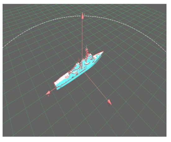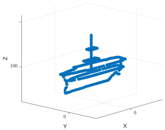 In order to verify the effectiveness of the dual base cooperative imaging method, a simulation is adopted. The point scattering model of a target ship is shown in Figure 5, which is composed of 367 scattering points. The ship size is , . The carrier frequency of radar 1 is . The carrier frequency of radar 2 is . The signal bandwidth is and . The modulated signal from radar 1 is a sequence of non-repeating random integers of length in interval . The modulated rule from radar 2 is . The geometric scene of the bistatic cooperative imaging is shown in Figure 6, with the ship located at the origin of the coordinate system . The bistatic imaging platform flies forward along the Y-axis at altitude and has the flight velocity . The distance between radar 1 and the center of the ship at the initial moment is 10 km. The target is in a maneuvering state, and the projected component of the moving speed on the radar line of sight is . At the initial moment, the distance between radar 2 and the center of the ship is 10.017 km. The azimuth angle and pitch angle in the target coordinate system are and , respectively.