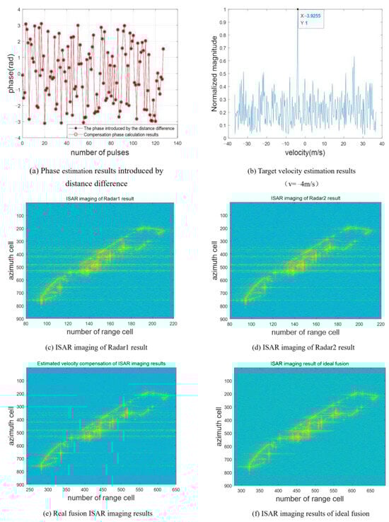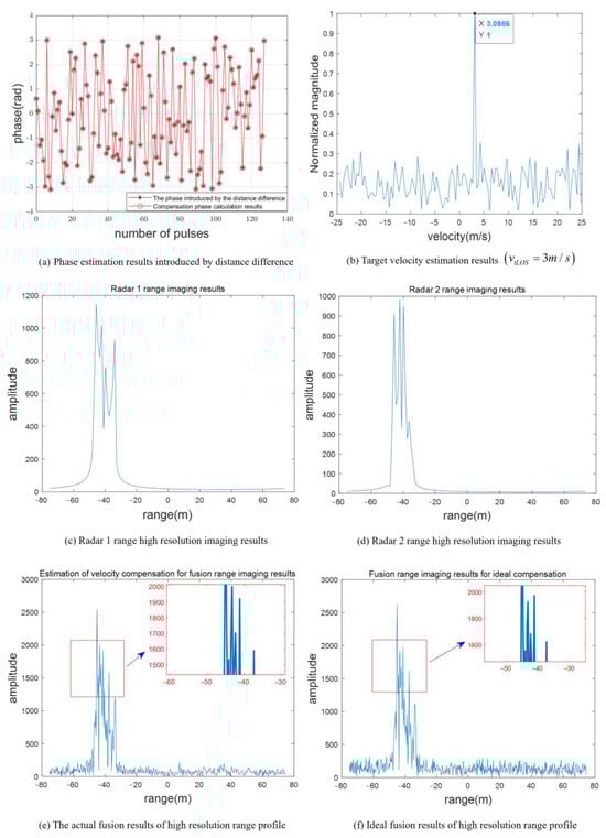 In this paper, the complementary random frequency-hopping waveform designed is used to detect the target. The target echo sequence after separation using the band pass filter is expressed as . Equation (8) is used to calculate the phase introduced by radar range difference, as shown by the black asterisk in Figure 7a, and the theoretical calculation results of this phase are also given in the figure by red circles. In Figure 7a, the proposed method can effectively eliminate the phase term introduced by the platform distance difference. Figure 7b shows the FFT transformation result of . By Equation (14), the target velocity estimated according to the peak position is 3.099 m/s. It meets the requirements of Equation (15) . Therefore, target range imaging has good focusing performance. Figure 7c and d show the range imaging results of the two radars, respectively. Due to the limited bandwidth, the scattering centers are distributed in a small number of range units. Few target details can be obtained. The range image with high resolution fused by the proposed method is shown in Figure 7e. Meanwhile, the high-resolution range image with ideal compensation of target velocity is given in Figure 7e. In Figure 7c and e compared to, for example, the fused range image provides richer target details than the single radar range image, and the estimated speed accuracy can meet the focusing requirements of high-resolution range imaging.