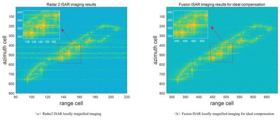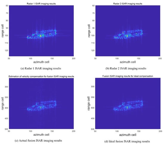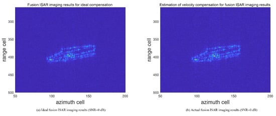 The two-dimensional radar imaging results obtained by the envelope alignment and initial phase correction using the envelope cross-correlation method and PGA method are shown in Figure 8. Among them, Figure 8a and b show the independent imaging results of radars 1 and 2, respectively. Due to the limitation of the range resolution, the targets are distributed in about 15 range units in the range direction. The scattering center distribution is fuzzy, and the target contour is unclear. The fusion imaging results adopting the model are shown in Figure 8c. As the signal band grows, the target scattering center distribution area becomes larger, about 50 cells, providing more target details. ISAR imaging under ideal compensation of speed is presented to verify the focusing performance of the image by contrast [25]. Among them, the contrast of the actual fused ISAR image is 16.38, while the one with the ideal compensated ISAR image is 17.26. Figure 9a and b show the comparison of imaging results in a noisy environment (SNR = 0 ). The contrast of the actual fused image in a noisy environment is 7.88. Moreover, the contrast of the ideal compensated ISAR image in a noisy environment is 8.45. Using AMD Ryzen 7 5800H with Radeon Graphics 3.20 GHz CPU and MATLAB 2020a, the average computation time for the proposed imaging algorithm is 9.18 s. The calculation time of the single base radar imaging algorithm is 8.82 s. In practical applications, the computing speed can be greatly improved by improving hardware configuration and the GPU parallel acceleration. Thus, the experimental results show that the proposed method can effectively realize the motion compensation and obtain the fusion images of the target.