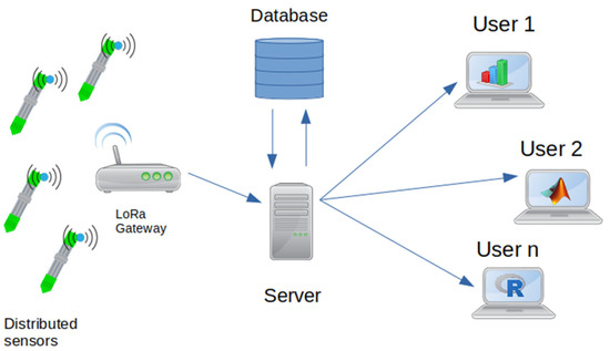 Our main design requirement was for the probes to operate under environmental conditions of a wide range of terrestrial landscapes, providing spatial coverage across any given site. In use, the probes would be placed into the soil at different depths, vertically up to a maximum of 15 cm, or horizontally into a soil profile. Having sensors at various depths within a single location would facilitate post hoc flux calculation of CO2 transport through the soil profile using the flux gradient method [43]. Each probe would measure CO2 concentrations at the expected levels found in soil [44] for an extended duration running on batteries. The probes would also be required to measure environmental factors (temperature and humidity), which are key factors that regulate soil microbial activity and associated respiration. Soil–atmosphere carbon flux can also occur via loss of volatile organic compounds (VOC) originating from litter, plants and soil microbes, and furthermore VOCs may provide a convenient means of measuring soil microbial activity [45]. Therefore, the capacity to include measurement of soil VOC concentrations was also considered. Based on this requirement, we developed a system based on an array of sensor probes and nodes to collect local soil CO2 concentrations, which can then be transmitted to a single gateway. The gateway then transmits the data to a server/database that can be accessed at any time by users. The basic concept of our system is shown in Figure 1, with the sub-systems described in the following sections.