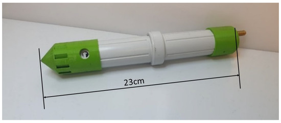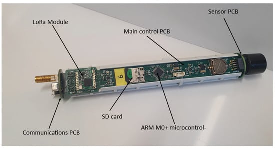 The main probe unit was divided into three printed circuit boards (PCBs), with one for the sensors, one for the main control electronics and one for communication and connections. The communication PCB contained the aerial connection, USB connector and a tri-colour LED to indicate the status of the unit. This solution ensured that the PCBs would fit into the selected housing for this project. The housing was a three-piece plastic unit, which was re-purposed from an Alphasense (Essex, UK) Electronic Diffusion Tube unit. The housing also contained a battery holder for 2 off 3.7 V 14,500 rechargeable batteries. A photograph of the casing and of the internal configuration are shown in Figure 3 and Figure 4. A 3D-printed protective cover was made for both ends of the probe to reduce water ingress while also allowing air movement into and out of the unit. The probe was 230 mm long and a maximum of 35 mm in diameter, and with batteries weighed 172 g.
