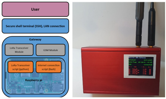 The purpose of the gateway is to connect to the sensor probes and receive data. Each probe was given a unique address, and therefore the gateway can communicate independently with each probe. In our solution, a Raspberry Pi 4 (Cambridge, UK) was used as a gateway, fitted with an Adafruit LoRa bonnet (model RFM96 @ 433 MHz, for Europe). Additionally, a mobile 4G cellular module was used that allowed the Raspberry Pi to upload data to a server without relying on a Wi-Fi or wired connection (Raspberry Pi hat). The setup required two programming scripts: one to manage the LoRa module (written in Python) and one to manage the cellular connection (Bash shell script), which were both executed at start-up. This setup is shown in Figure 5 below.