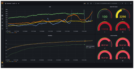 The dashboard pulls data directly from the database, in real time, so any issues can be flagged rapidly. The dashboard can be configured to display any part of the recorded data from any time. Figure 6 shows the time series alongside the latest recorded value (shown here rewound to the experiment dates). The website was hosted on a Virtual Private Server (VPS) provided by the UK company Fasthosts. The dashboard visuals were created using the Grafana web application running on the server.