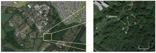 Satellite image of device location [Google Maps, accessed 29 March 2022]. Probes A&B in open woodland, C&D placed under tree.