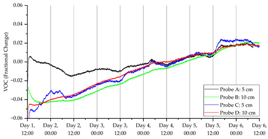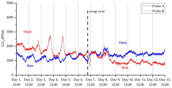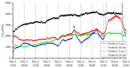 To show the ability of the probes to monitor CO2, temperature, humidity and VOC index over the five-day experimental period, the dynamic responses of two pairs of sensors (one at 5 cm and the other at 10 cm) are shown in Figure 9, Figure 10, Figure 11 and Figure 12. Figure 9 shows the CO2 response from a pair of probes in open woodland (A and B) and under a tree (C and D), respectively.