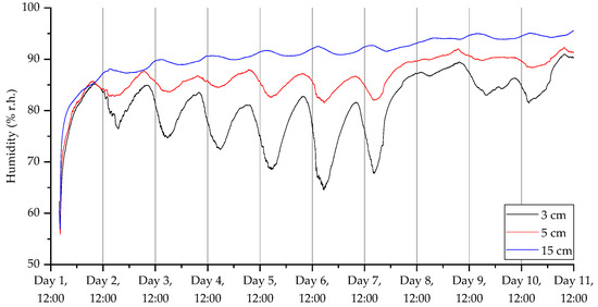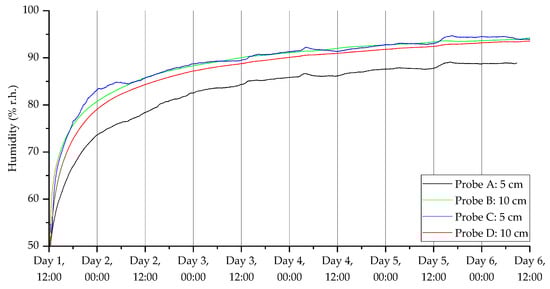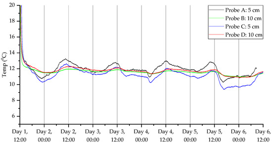 Once the soil ecosystem re-stabilized, the CO2 level increased back to a normal state. It was also observed that the CO2 levels in the open land were higher than from under the tree. Furthermore, the CO2 levels were higher closer to the surface for open measurements and the opposite for under the tree. It is possible that tree root concentrations at 10 cm generated CO2, resulting in higher concentration relative to 10 cm probes in the open area. Furthermore, in probes located under the tree, there was evidence of a dip in CO2 concentration during the night across all days for probe D, and for probe C across days 3–5. This could reflect diurnal changes in tree root and root-associated microbial community respiration associated with diurnal change in carbon fixation and root exudation. Readings were also taken using the humidity (Figure 10) and temperature (Figure 11) sensors. The humidity sensors showed a slow increase in humidity levels before stabilizing around 90% RH. The temperature readings dropped rapidly down to ambient temperatures (around 12 °C), which was appropriate for autumn in the UK. The temperature sensors also measured the daily cycle in temperature (the probes were fitted at 11 am GMT time). It can be seen that the temperature cycles were more pronounced with the probes located closer to the surface over those embedded further into the ground.
