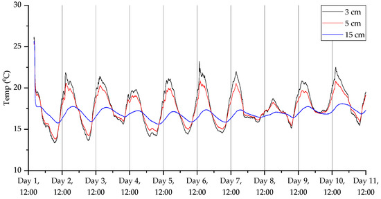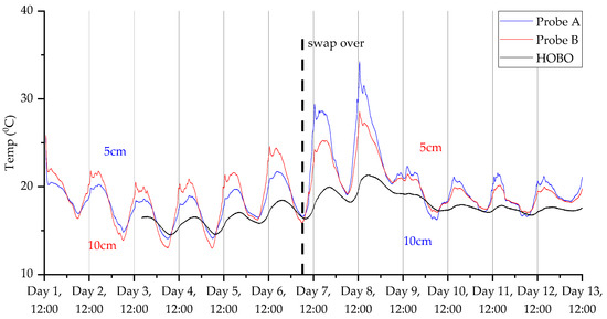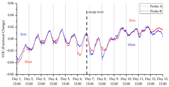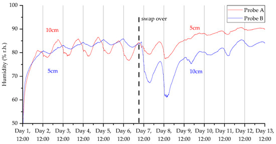 The decrease in sample frequency from one per minute to one per two minutes for deployment 2 considerably improved the lifespan of the device, as we were able to gather up to 14 days of data compared with only 5 days in the first deployment. Additionally, Figure 13, Figure 14, Figure 15 and Figure 16 show that the switchover procedure resulted in a step change towards the partnering probe. This demonstrates the probe’s reliability and accuracy. Furthermore, we can see in all measurements that there is a diurnal pattern. The high temperature peak observed in Figure 15 was from the hottest day on record in the UK (at the time of this publication), where daytime temperatures reached close to 40 °C at the deployment.