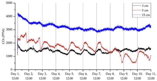 All sensors showed initial CO2 readings that were close to ambient above-ground levels and then rapidly increased over a short period of time. There was a universal increase in concentration through the period of the experiment, which is likely related to the soil restabilizing from the disturbance associated with fitting the probes. Constructing a hole is likely to disturb soil and increase aeration, stimulating microbial activity and production of CO2 [46]. We expected the physical removal of a soil core and replacement with our sensor to stimulate CO2 emissions due to enhanced microbial activity at the soil–sensor interface. However, CO2 concentrations were depressed at initial insertion, followed by gradual increase to a baseline over 24 h. One possible explanation is that soil at the interface had been compacted by the corer, inhibiting gas exchange at the onset. Future applications of this system (e.g., calculating flux) will need to take this potential interference into account, likely via soil texture corrections [43].