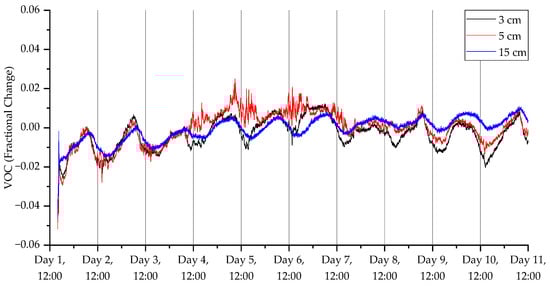 The results from the third deployment (Figure 17, Figure 18, Figure 19 and Figure 20) again show a diurnal pattern for all parameters. Perhaps most notable are the results shown in Figure 17, where on day 7 we can see a shift in flux between the 3 and 5 cm probes. As with the other deployments, apart from the open woodland set in the first deployment, there was evidence of higher CO2 levels deeper beneath the surface. For CO2 concentrations, humidity, and temperature, there were well-defined diurnal patterns, which were dampened at 15 cm relative to 3 and 5 cm. At 3 and 5 cm depth, peak CO2 concentrations were recorded at approximately 3 pm, while the lowest concentrations were measured at approximately 6 am. At 15 cm depths, peak CO2 concentrations were detected at midnight and the lowest concentrations were found at midday. The highest humidity was recorded at 6 am at 3 and 5 cm depth, and at midday at 15 cm depth, while the lowest humidity was measured at approximately 6 pm at 3 and 5 cm depths, and approximately 4 am at 15 cm depth. Diurnal rhythmicity of humidity persisted between days 1 and 8 but was not detected subsequently. Temperature patterns were conserved across 3, 5, and 15 cm depths, peaking at 4 pm and reaching their minimum between 2 and 4 am, with higher temperatures and greater diurnal range at 3 and 5 cm depth relative to 15 cm depth. VOC concentrations were not consistently different across soil depths, but there were diurnal differences in concentration across all depths, with the highest concentrations at 5–7 am and lowest concentrations at 2–3 pm.