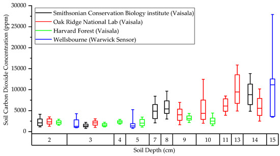 The use of commercial CO2 probes in soils research is best highlighted by the National Ecological Observatory Network (NEON) throughout North America. In conjunction with other environmental measurements, Vaisala GMP-343 NDIR CO2 probes have been placed at various soil depths from 0 to 20 cm, replicated across 46 sites in continental USA, Hawaii, and Puerto Rico. To assess our probes against a commercial system, we compared publicly available soil CO2 data from three eastern USA NEON sites, with similar vegetation to the Wellesbourne woodland, against our concentrations from deployment three. NEON data was taken from the same time period (26 September–6 October 2022) [47]. We can see that when all CO2 concentration datapoints from within this timeframe are plotted as a function of soil depth, there is a clear trend of increasing CO2 concentration with depth (Figure 21). This is regardless of probe type, illustrating that our system compares well with commercial systems. Further, it could be argued that our system exceeds the capacity of the Vaisala GMP-343 by being completely wireless.