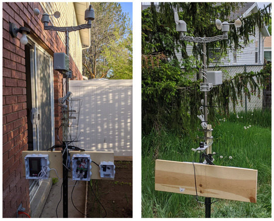 The left picture shows a weather station during a trial run in Logan in a small backyard next to a brick wall with a window; no data were collected at this site. The right picture shows the back side of the same station deployed at a private 6-hive apiary in Logan, where the weather and electromagnetic radiation data were collected from May 16 to 1 September 2020 (see Figure 2).