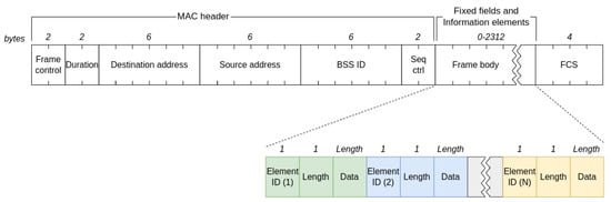 Figure 1 shows a generic WiFi management frame. Management frames are denoted by the Subtype field of the Frame Control field. Frame body of management frames uses fixed-length fields called fixed fields and variable-length fields called Information Elements (IE). While fixed fields do not have a header as their length and order are predefined, the first octet in IE fields defines the element ID and the second octet defines its length. The mandatory IEs in the PRs’ body frame are Service Set Identifiers (SSIDs), i.e., the unique names of WiFi networks that the device was already associated with in the past, and supported data rates. Based on IE data in the received PR, the access point determines whether the device fulfills the conditions to join the network or not.