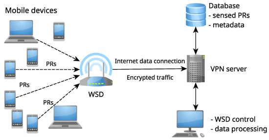 The system shown in Figure 2 is composed of a WSD for capturing WiFi network management traffic which is connected either via the wireless access point or with an Ethernet cable through a secure VPN connection to the remote database. The database stores raw data for further processing, together with additional metadata about the deployment and optional pre-processed data. Once the data are stored in the remote database, it can be further analyzed either in real time or by using more complex algorithms for post-processing the collected data.