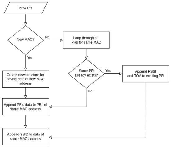 For each new PR, the procedure first checks if its MAC address has already been detected and saved in the current scan time. If not, a new data structure is created under the new MAC address for storing PR’s IE data and SSIDs. If the new PR contains one of the already existing MAC addresses from the current scan time, the procedure compares new IE data with already recorded IE data for the same MAC address. If identical PR’s IE data from the same MAC address are already stored, then only data for ToA, RSSI and SSID are appended to the existing data structure. Thus, the database is reduced and PRs can be compared more efficiently. However, if no identical PR’s IE data have yet been recorded with the same MAC address, then a new data structure under the same MAC address with new PR’s IE data and possible new SSIDs is appended.