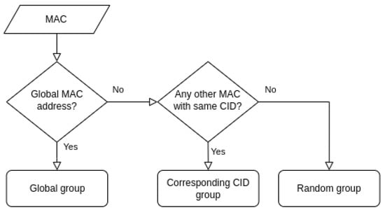 Furthermore, random MAC addresses are mapped according to their CID value. If no CID group is found for a particular MAC address, it is assigned to a Random group which corresponds to devices with random MAC address and no manufacturer identifier. This additional subgrouping allows for the finer matching of similar MAC addresses, as it is assumed that a WiFi-enabled device that sends PRs with a completely random MAC address will not send subsequent PRs with a known CID as part of its MAC address. The described initial grouping procedure is shown in Figure 4.