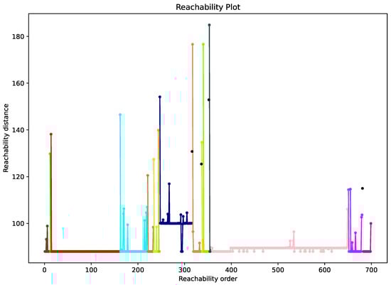 The OPTICS algorithm does not explicitly cluster the data into groups. Its output is a visualization of the reachability distances of points in the same order as processed by the algorithm. The order in which the algorithm selects points is based on the reachability distances. The point with the smallest reachability distance is selected first. The resulting 2D representation is called a reachability graph and is shown in Figure 5. The points belonging to the same cluster have low reachability distance, so they appear as valleys on the reachability diagram. The valleys are separated by spikes corresponding to the distances between clusters or between a cluster and a noise point. In other words, the peaks on the reachability plot indicate the beginning of a new cluster, as also indicated in Figure 5 by different colors.