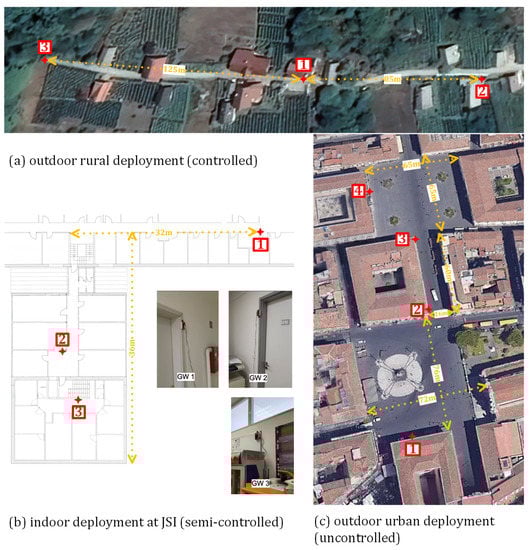For validation in a controlled rural environment, we deployed three WSDs for the acquisition of PRs, which were sending data to the remote database using a cellular network. As shown in Figure 6a, they were placed in three different locations with non-overlapping WiFi coverage. The three WSDs recorded no PRs when test devices were turned off; thus, the deployment can be characterized as completely controlled without external interference. Data gathered at this location are taken as a ground truth for each device individually and as group behavior when multiple devices were active near WSD.