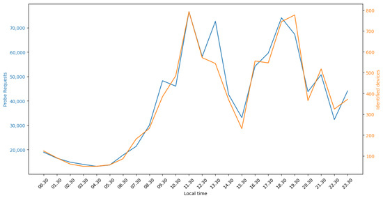 The number of PRs and the number of devices identified by the proposed method in an hourly time slot for the 24 h period are also shown in Figure 7. It can be observed that the number of PRs coincides very well with the number of identified devices. During night-time hours, a higher number of devices than expected are identified due to nearby static devices not being filtered out. Since the method compares each PR with all the remaining PRs, the computational complexity of the method increases exponentially with the number of recorded PRs. Therefore, in busy urban environments with a high volume of pedestrians and consequently a huge number of recorded PRs, the identification of unique devices may not be possible in real time, indicating one possible direction for further optimization of the algorithm.