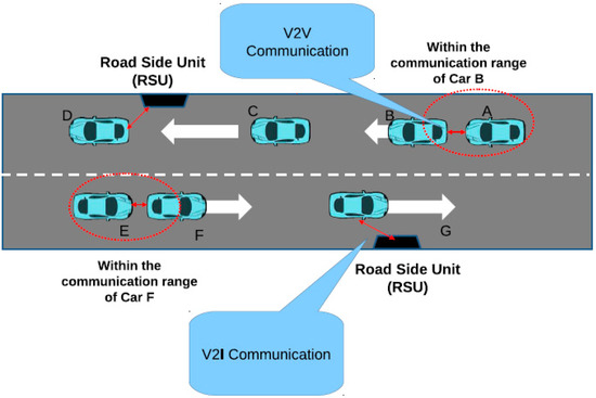 Figure 3 provides the effective communication range for VANET architecture. The architecture shows that during the V2V communication, two vehicles communicate with each other, i.e., vehicles A and B. During V2I communication, the architecture is communicated with the vehicle, i.e., RSU is communicating with vehicle G. The communication range is defined under every vehicle, based on the area surrounding the vehicle, in which it communicates with other vehicles or infrastructure [
