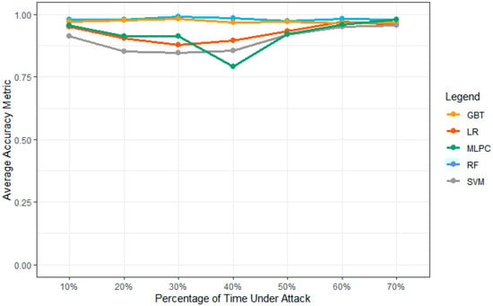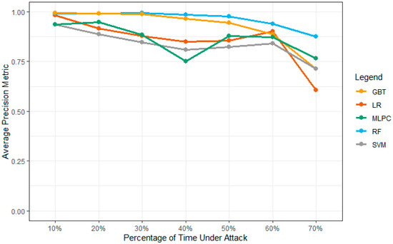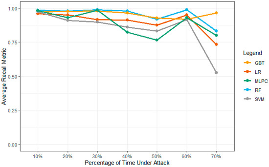 Figure 16. The models such as GBT, RF, and MLPC, performed best over the network attack percentage and average recall metric at a 40% attack density of MLPC. At 60%, all the models show the highest recall results over density values, and then over 50% of these results show the highest recall values for all models. The GBT drops over 70% of the network attack density for network performance management. Based on the results, it clearly shows that LR performs better as compared to other results and outperforms over the same network density values. The SVM produces similar results to LR, but the results are comparatively weak compared to SVM.