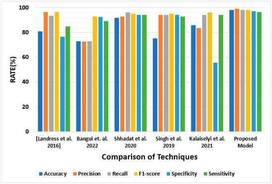 The results are compared with existing methodologies. This shows that the proposed approach performs better than the previous approaches mentioned in the results. The evaluation parameters are accuracy, precision, recall, F-1 score, specificity, and sensitivity.