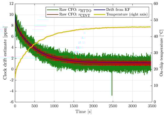 The raw relative CFO estimates based on RTTO and carrier integrator are provided in Figure 1. Obviously, the RTTO-based CFO () is significantly noisier than the -based CFO (); the accuracy of both CFO estimates is clearly not limited by the resolution. The clock drift estimated by the Kalman filter (, see (1)) is smooth in comparison with the CFO estimates. On the right axis of Figure 1 is the on-chip temperature of the device; moving average with 101-sample symmetric window has been applied in order to improve readability. The dependency of clock drift and temperature is apparent.