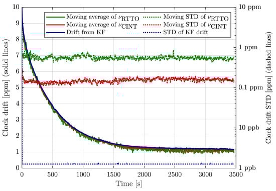 The moving standard deviations in Figure 2 are compared to the standard deviation of the Kalman filter drift estimate, which is deduced from the KF-state a posteriori covariance matrix (). The KF-based estimate STD is below 1.5 ppb once it converges within a few measurements. The moving STD of RTTO-based CFO estimate is between 0.4 ppm and 0.8 ppm, the -based CFO is approximately 4-times more accurate; its moving STD is mostly between 0.1 ppm and 0.2 ppm.