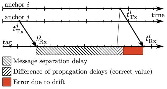 Therefore, all the messages contain their time of transmission () expressed in the master time, and its variance. The drift of the anchors local clock with respect to the master time () is included in the message as well, along with the respective variance. With ideal, non-drifting clocks, the correction of the measured TDoA would be trivial; the difference of distances between tag and anchors indexed by i and j would be