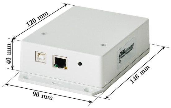 The testbed is a room of dimensions 4.4 by 9.7 m with a ceiling height 2.75 m. Six UWB anchors were mounted on the bottom of a suspended ceiling light, their antennas were located between 2.52 m to 2.57 m above the floor. The anchors were powered and connected to the controlling computer by means of Ethernet cabling with Power-over-Ethernet capability. The detail of the anchor device with its key dimensions is provided in Figure 4. It is worth noting that identical hardware was used as the tag. An annotated photo of the testbed during measurement is provided in Figure 5.