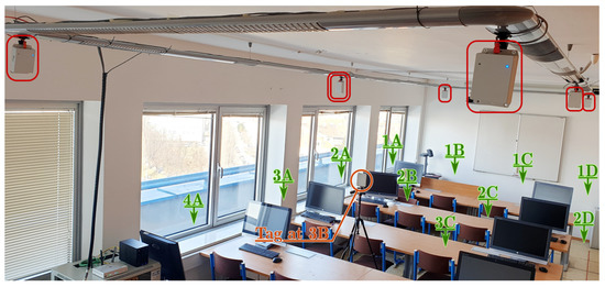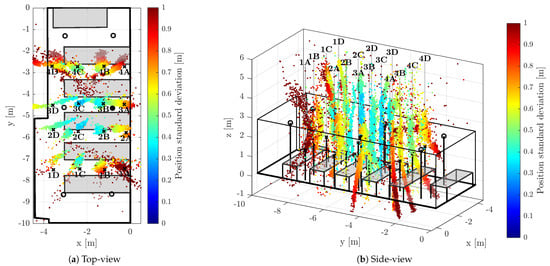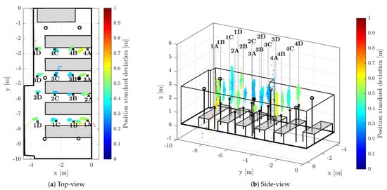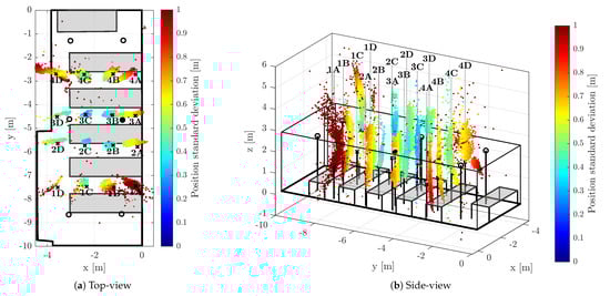 During the test runs, all messages received by the tag were stored, including the necessary timestamps and CFO estimates obtained by both methods (RTTO and ). Consequently, all the methods of interest are evaluated at once, inherently under identical conditions and using the same message data and timestamps. The 16 measurement points were organized in a 4-by-4 grid; the points are identified by a number indicating row and letter indicating column, when observed from above. The point 1A is located in the bottom-right corner of Figure 6a, Figure 7a and Figure 8a, the point 4D is in the top-left corner. The tag was mounted on a tripod stand approximately 1.55 m above the floor; the ground-truth position was surveyed by a point-to-point laser distance measurement device at each location.