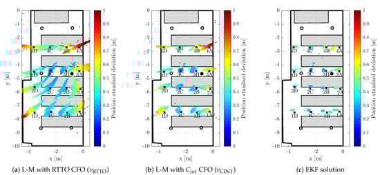 Although the 2D TDoA with the CFO aiding based on RTTO measurement () is more accurate than its 3D counterpart, the accuracy is still rather poor. The planar positioning results can be seen in Figure 9a. It is necessary to note that neglecting the vertical coordinate leads to substantially higher validation pass-rate, which reaches 98.5%. The non-weighted statistics of the 2D solution with RTTO-based CFO aiding are provided in the left part of Table 3. It is apparent that in total the horizontal standard deviation () and RMS error () are approximately a third of the values obtained by the 3D solution (see Table 1).