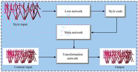 The model by Pan et al. [1] does not require data labeling and employs convolutional layers in an unsupervised fashion. The meta-network obtains style attributes extracted from the motion style at run time and establishes a link transformation network for motion style transfer. The calculation of style attributes of motion is performed in conjunction with the loss network and output values. A meta network-based motion style transfer from motion-captured datasets is shown in Figure 1.