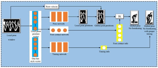 The proposed method primarily divides the different components of the task for motion style transfer and trains each task separately. The style transfer tasks are divided into three sub-tasks: (i) a pose network, (ii) a timing network, and (iii) a foot contact network. All of these sub-tasks are separately trained to accomplish their respective predictions. Specifically, pose networks and timing networks are used to predict the spatial and temporal style variations, respectively. The foot contact network is trained for the removal of foot skates so that realism in style transfer may be achieved. These three sub-tasks are collaboratively executed in a pipeline to accomplish motion style transfer. A brief overview of Smith et al.’s [8] method for motion transfer is presented in Figure 3.