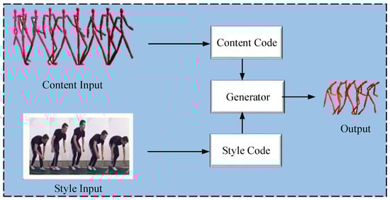 Several authors [38,39,40] have designed DL architectures to learn special–temporal relationships for motion style transfer. These architectures aim to model the temporal motion parameters and decompose the spectral motion parameters for spatiotemporal style transfer [41]. For example, Zhang et al. [26] made adjustments in expert weights by using a gating network; this resulted in a mixture of the scheme.