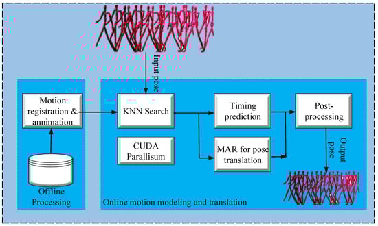 The proposed model in [25] is a data-driven method that consists of three major components: (i) motion registration and annotation, (ii) stylistic motion modeling and generation, and (iii) post-processing. In the motion registration and annotation phase, all actions in the input database are registered against motion examples. After the registration process, the motion examples are annotated in terms of actions, styles, and contact information of the motion. The stylistic motion modeling and generation phase uses the input motion database to model the spatial–temporal relationship between the styles. In this phase, an online learning approach is used to automatically build a set of regressive models. These local regressive models help approximate the spatial–temporal transformations and are built by the motion examples corresponding to every input style in the database. The local regressive models can handle the unlabeled input motions. The synthesized motion sometimes violates kinematic constraints enforced by the environment due to environmental contact. Thus, the post-processing phase is performed to automatically annotate such constraints in motion data. An overview of Xia et al. ’s [25] method for motion transfer is presented in Figure 5.