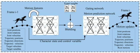 Zhang et al. [26] present a neural network-based model named Mode-Adaptive Neural Networks (MANN) to control quadruped characters. MANN is a time series prediction system that predicts the character’s state by learning from its state in the previous frame. The architecture of MANN mainly consists of two components: (i) a motion prediction network and (ii) a gating network. The weights of the motion prediction network are dynamically computed with the help of the gating network. The gating network uses motion features from the input and computes the expert weights for the motion prediction network. MANN architecture for motion style transfer is shown in Figure 6.
