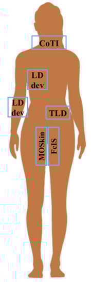 Sketch of the body sites investigated with dedicated devices or sensors described in the text.