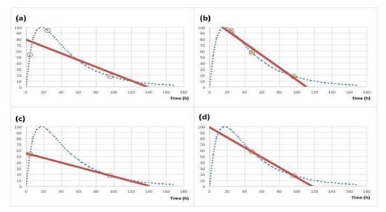 Example of the impact of data point sampling (4, 24 and 96 h vs. 24, 48 and 96 h, panel (a) and (b), respectively) or density (3 vs. 2 data points, panel (a) and (c) or panel (b) and (d), respectively) on the TAC estimation using a linear model (continuous line). The blue dotted line represents the expected theoretical TAC.