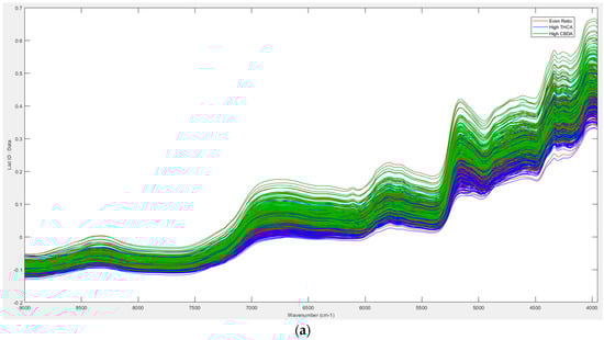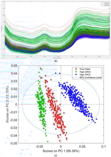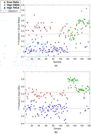 The dataset scanned with the Bruker MPA II had a total of 734 finely ground samples. Sensitivity prediction and specificity prediction values were one and equal for the high-CBDA and high-THCA predictors (Table 1). Typically when sensitivity and specificity values are equal to each other, this is an indicator of a highly accurate PLS-DA model []. Our prediction models showed a classification accuracy of 100% (Class Error Pred. = 0%) for both high-CBDA and high-THCA models and 99.4% (Class Error Pred. = 0.7%) for even-ratio models. These models showed excellent results in predicting high-CBDA, THCA and even-ratio classes.