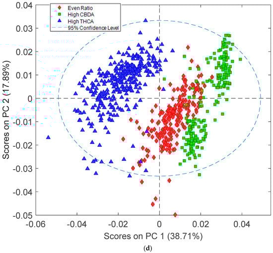 The PLS-DA model using the MicroNIR data had a total of 730 samples for each cannabinoid. PLS-DA modelling for MicroNIR used the same definitions for even ratio, high CBDA and high THCA (Figure 3a–c). High THCA had a classification accuracy of 100% (Class Error Pred., 0%); high CBDA was at 94.5% (Class Error Pred., 5.5%); and even ratio was at 83.1% (Class Error Pred., 16.9%) (Table 2). Whilst the predictions for high-THCA chemovars were accurate, reduced accuracy for the high-CBDA and even-ratio predictions were possibly due to the limitation of the resolution and range of the Micro NIR. Duchateau et al. used handheld NIR devices to create prediction models and focused on discriminating between ‘illegal’ (THC content > 0.2% w/w) and ‘legal’ cannabis. From a law enforcement perspective, this is useful, but this research is not able to truly define chemovars as high-THCA or high-CBDA classes []. The purpose of comparing the two instruments in the current study was to identify a rapid, field-deployable and inexpensive cultivar assessment tool for use in the cannabis industry in both commercial and research settings. Limited research has used MicroNIR and other handheld devices to develop prediction models, and researchers have typically built PLS-R models [,,] over PLS-DA models. However, when considering the ability to rapidly quantify cannabinoid content, it largely rests on user requirements, for example, an exact concentration, which provides a numerical value or a classification on whether it is a high-THCA or high-CBDA chemovar []. Classification prediction models may be more useful than rapid cannabinoid assessments for cultivators where precise cannabinoid quantification values may not be the priority, as opposed to guaranteeing whether a cannabis plant is a high-THCA or high-CBDA chemovar.