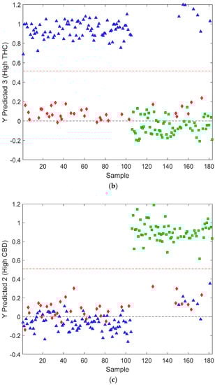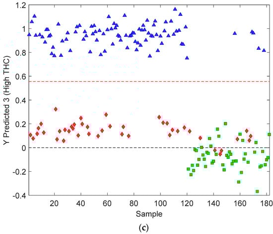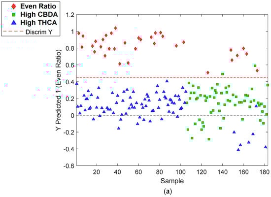 PLS-DA models were able to divide the cannabis dataset into the three previously described categories: the even-ratio, high-CBDA and high-THCA classes (Figure 2a–c). High CBDA was defined as classes that had a concentration ratio of CBDA to THCA higher than 6:1; high THCA had a concentration ratio of less than 1:6; and even ratio had concentration ratios between 6:1 and 1:6 (CBDA:THCA) (refer to Table S3).