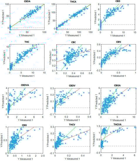 Plot of measured values versus the predicted values of cannabinoids in the validation dataset with data obtained from the VIAVI MicroNIR instrument processed from the PLS_toolbox using the PLS-R tool. Cannabidiolic acid (CBDA), tetrahydrocannabinolic acid (THCA-A), cannabidiol (CBD), tetrahydrocannabinol (THC), cannabichromene (CBC), cannabinol (CBN), cannabidivaric acid (CBDVA), cannabidivarin (CBDV), cannabigerolic acid (CBGA), cannabigerol (CBG), tetrahydrocannabidivarin (THCV), tetrahydrocannabidivarinic acid (THCVA), cannabinolic acid (CBNA) and cannabichromenic acid (CBCA). Units are expressed in mg/g. Green line: line of best fit from reference data; red line: line of best fit from predicted data.