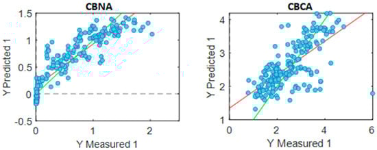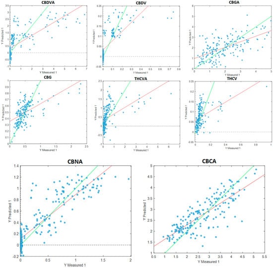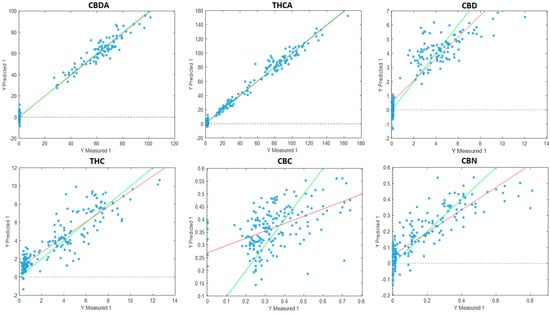 Plot of measured values versus the predicted values of cannabinoids in the validation dataset with data obtained from the Bruker MPA II instrument processed from the PLS_toolbox using the PLS-R tool. Cannabidiolic acid (CBDA), tetrahydrocannabinolic acid (THCA-A), cannabidiol (CBD), tetrahydrocannabinol (THC), cannabichromene (CBC), cannabinol (CBN), cannabidivaric acid (CBDVA), cannabidivarin (CBDV), cannabigerolic acid (CBGA), cannabigerol (CBG), tetrahydrocannabidivarin (THCV), tetrahydrocannabidivarinic acid (THCVA), cannabinolic acid (CBNA) and cannabichromenic acid (CBCA). Units are expressed in mg/g. Green line: line of best fit from reference data; red line: line of best fit from predicted data.