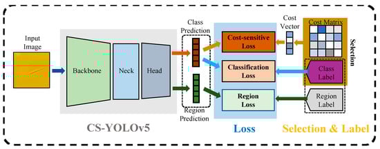 - Therefore, a classification loss function based on a label–cost vector selection method is designed, which can equip YOLOv5 with cost sensitivity after training. The misclassification cost involved might be the labor cost of defect detection, security cost, etc., which can be specified in practice by defining the cost matrix.