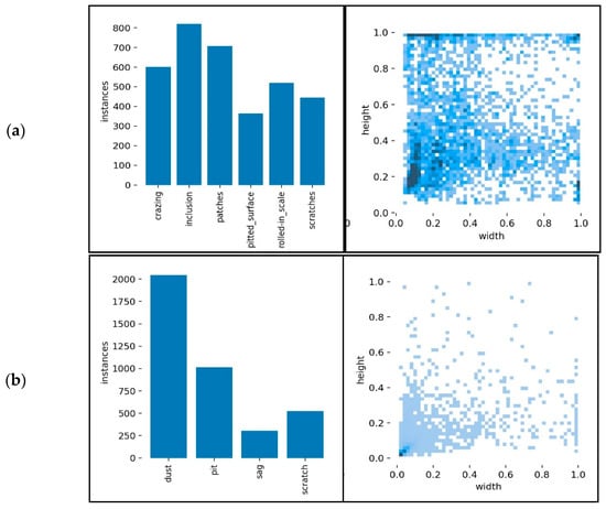 The class distributions and the size distribution of ground-truth bounding box of these two datasets are counted and shown in Figure 2a,b, respectively. In the bar figures, the values denote the statistics of the sample numbers for each class. For the NEU dataset, the number of sample classes is more uniform than Paint. The Paint dataset has obvious uneven sample distribution, in which sag and scratch are less than the other two classes, and most of the two classes are more than 75% of the total number of samples. This is because the frequency of sag and scratch is so low at the collection site. Thus, it is a long-tail problem, which is very common in application.