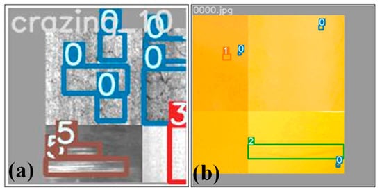 YOLOv5 was selected as the baseline model in experiments, whose code is provided by []. We experimented with several Tesla T4 GPUs and implemented the code with the Pytorch 1.7.1 platform. The initial learning rate was set to 0.002. The cosine annealing strategy was utilized during training. The weight decay coefficient was 0.0005 for the adopted SGD optimizer. The balance parameter β was set to 0.375, and η was set to 1/10,000. For the NEU dataset, the batch size was set to 230, with 90 epochs of training. For the Paint dataset, the batch size was set to 24, with 55 epochs of training. The experiments all used the Mosaic data augmentation method. As the examples show in Figure 3a,b, this augmentation method stitches images together in an overlapping manner to improve the robustness of the models.