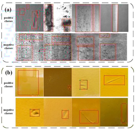 For the NEU dataset, positive classes were selected as Pa, PS, In, and Sc, while for Paint, dust and scratch were positive classes. Figure 4a,b shows the examples of positive and negative classes in NEU and Paint dataset, respectively.